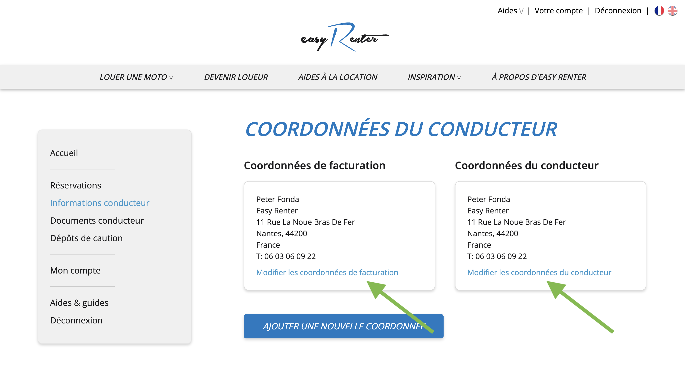- Cliquez sur Modifier les coordonnées de facturation et/ou du conducteur.